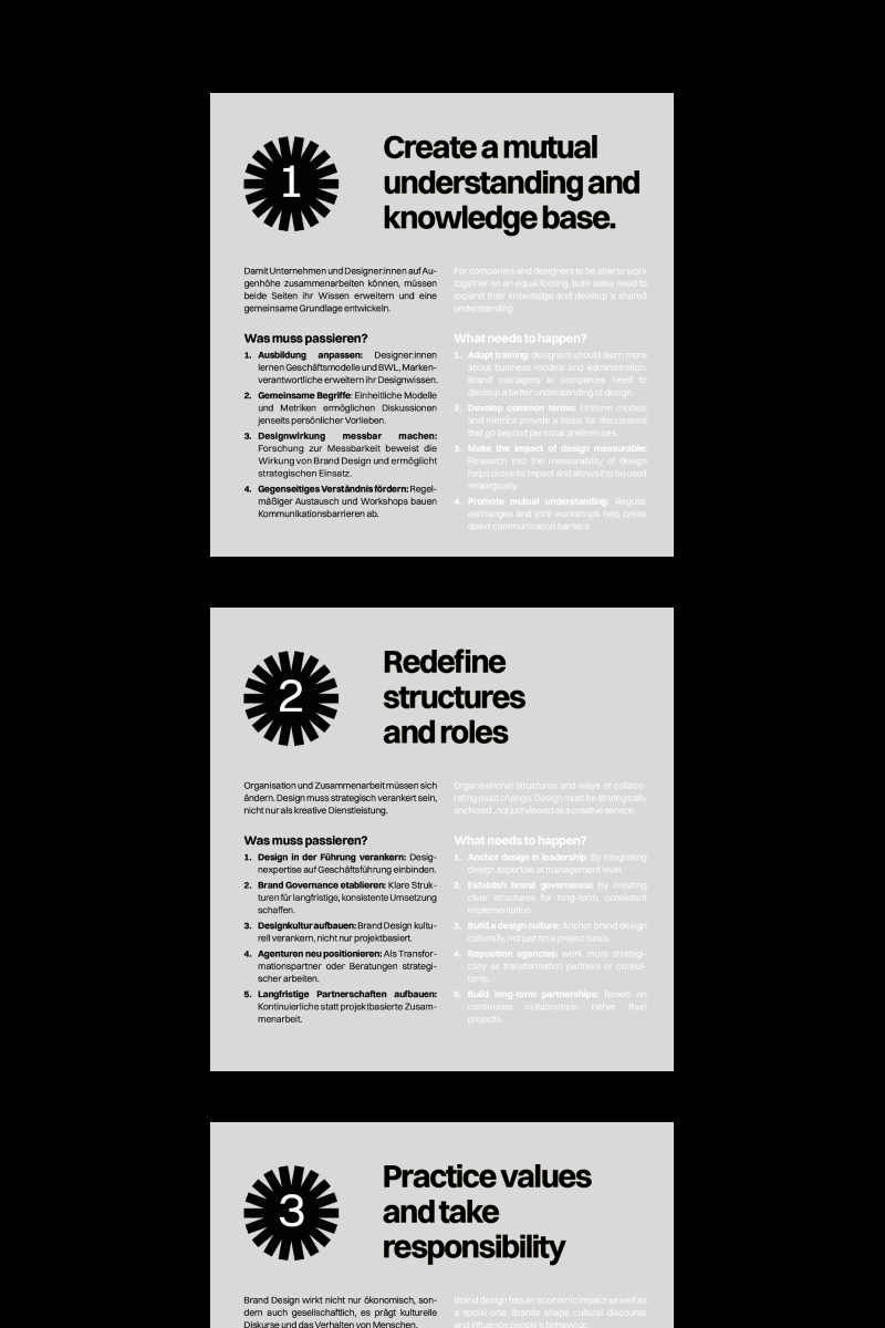 This project stems from an observation made during everyday design practice: although brand design is considered one of the most powerful drivers of business success in theory, in practice it is often reduced to purely aesthetic considerations. This work was motivated by the question of why design's enormous transformative potential at the interface with business often remains untapped. There is a discrepancy between what design could achieve and how it is actually integrated into companies. This project aimed to shed light on this issue by scientifically identifying the underlying barriers and highlighting practical ways to improve collaboration.